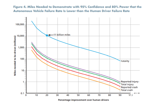 假设车队规模100辆,全年24小时无休并以45千米每小时的速度进行测试,大概需要500年。