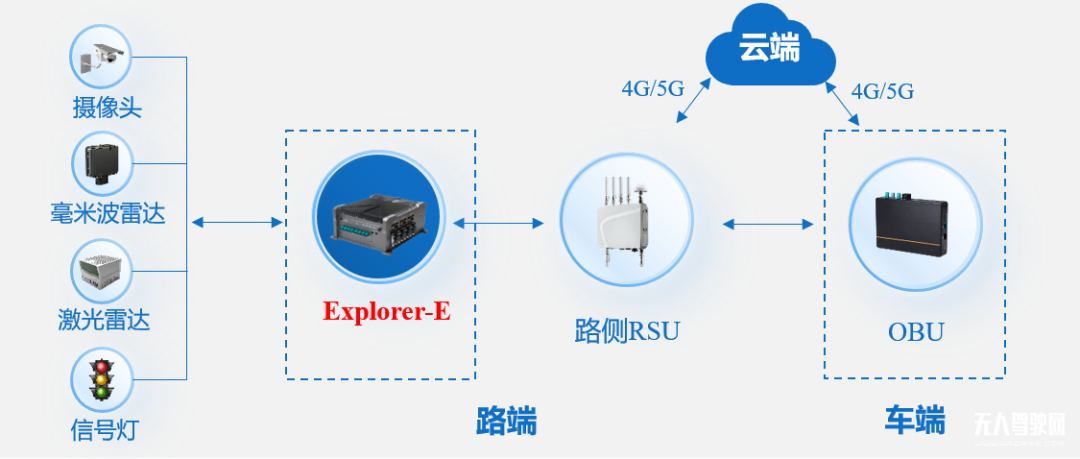 随着单车智能不断普及,单车智能实际中存在的诸多问题如长尾问题也不断暴露出来,严重影响无人驾驶的安全性。通过在路端部署传感器可以有效提升自动驾驶安全,弥补车端感知不足,扩展自动驾驶ODD(车辆运行设计域),提升自动驾驶的点到点能力,同时可以提高传感器的复用率,可避免重复建设,降低成本。利用Explorer-E,可以实现多源传感器的数据融合,为无人驾驶提供更高的安全性。图6显示的是Explorer-E在车路协同场景中的部署示意图。