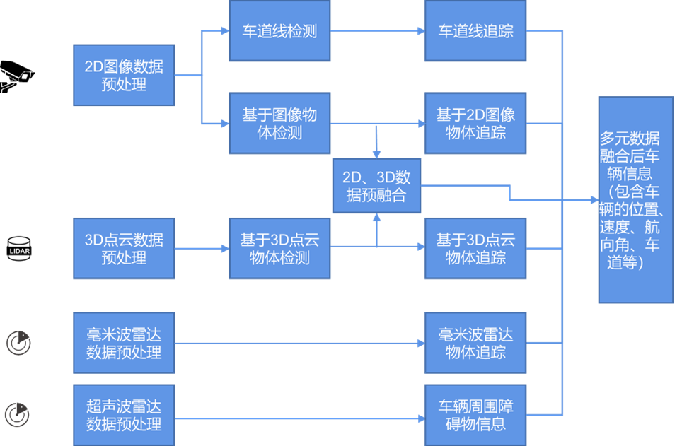 感知融合模块是利用激光雷达、摄像头、毫米波雷达、超声波雷达等传感器采集的路况信息,对采集到的信息进行基于人工智能技术的多源数据融合,实现对交通目标/事件检测识别,进而实现对路况全要素全时空的全量感知。
