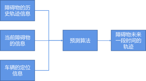 预测模块通过障碍物的历史状态信息以及感知模块感知的当前障碍物的信息结合车辆的位置和规划信息,来预测障碍物的未来一段时间轨迹,其框图如图4所示。感知模块作为预测模块的上游,向预测模块提供障碍物的位置、朝向、速度、加速度等信息。预测模块根据感知模块输出的感知信息,通过自身算法给出障碍物未来的预测行为和预测轨迹,供下游规划模块进行自车轨迹的规划。