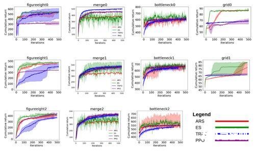 一旦我们制定好了基准,我们就要确保研究人员有一组基准值来检查他们的算法。我们执行了一个小规模的超参数扫描,然后将找到最佳超参数提供以下RL算法运使用:增强随机搜索,近端策略优化,进化策略和信任区域策略优化。