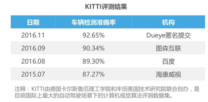 从KITTI数据集的比赛结果来看,ADAS感知层面的技术几乎在不断提升,以车辆识别监测准确率为例,各机构的成绩在不断上升,准确率达到92.65%。