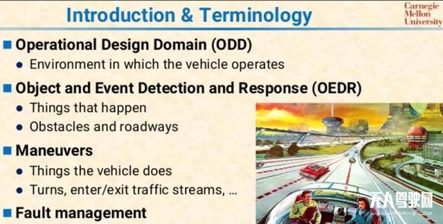 ODD:在实践中,为了确保可追溯性,通常将操作环境限制到人类驾驶员可以处理的所有可能情况的一个子集。这种限制系统运行环境的方法也被称为运行设计域(Operational Design Domain,ODD)。NHTSA(2017)将道路类型、地理特征、速度范围、天气等其他相关因素。在实践中,会发现其他因素可能会非常广泛。