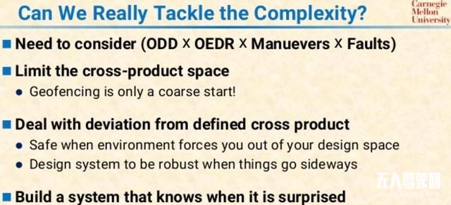 自动驾驶系统确认自动驾驶汽车能否上路的第一步是决定系统的哪些方面需要确认。 软件产品的验证(Verification)和确认(Validation)本文列出了自动驾驶汽车相关的运行设计域、对象和事件、车辆操作和故障管理。虽然此类清单做不到百分之百地测试和确认自动驾驶汽车的功能,但希望可以形成一个公众认知的起点,避免因为信息缺失,导致自动驾驶车辆的测试和确认与公众的认知产生巨大偏差。整个系统需要确认的关键部分是:确保自动驾驶车辆在其设计的运行环境中充分发挥作用。传统的软件确认包括需求和系统级测试的可追溯性。但由于机器学习使用基于数据训练的方法,而非传统的设计步骤,传统的确认方法不再适用。因此,确认这一步骤至少需要保证训练和测试数据包含所有相关的运行条件。具体可分为四个方面: