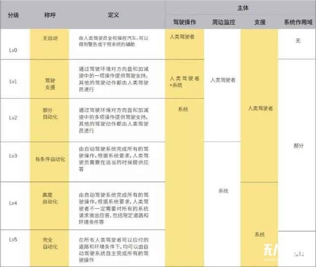 自动驾驶技术的研发是渐进式的,都有相应的规范和标准,需要明确的分级标准来引导行业发展。目前对于自动驾驶分级最为权威的标准是美国汽车工程师协会(SAE)的J3016标准,将自动驾驶分为6个等级,并明确了不同级别间的差异,如表1所示。