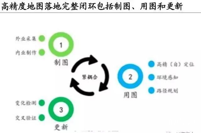 高精地图落地的完整闭环包括制图、用图和更新三个紧耦合的过程,以保证数据的高频流动和更新。制图包括外业采集和内业制作,用图包括高精定位、环境感知和路径规划,更新包括变化检测和交叉验证。其中较为关键的环节是高精地图的采集和更新。