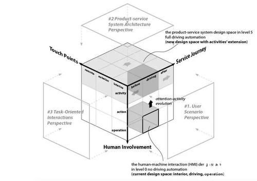 在产品逻辑上,我们必须考虑自动驾驶产品服务系统的三个基本维度,包括基于上文所述的驾驶员/用户注意力-活动变化下系统中的人的参与程度、体现具体业务流程的服务旅程以及接触点,包括如何使用核心产品(车辆)和其他相关产品和系统。通过整合这三个维度(人的参与、服务旅程和接触点)去思考将为我们揭示一些新的设计机会。