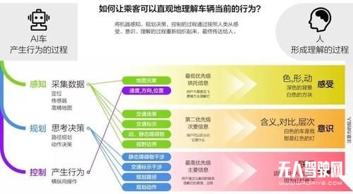 如何把AV那些复杂且工程的信息简化成乘客容易理解且关心的信息呢?我们的方式是将信息按照用户认知的过程分级,逐级将AV世界的信息呈现给用户。