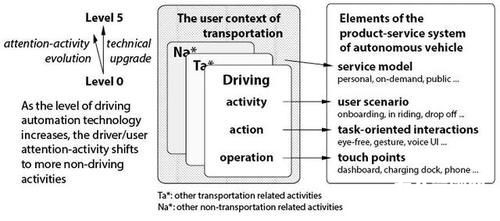 未来将以基于旅程相关的产品服务系统设计复杂的可持续性的汽车行业设计生态,我们采用产品服务系统(PSS)设计思路,推演出一种基于用户注意力-活动维度伴随自动驾驶技术升级而产生的变迁及其对应的设计考量因素。