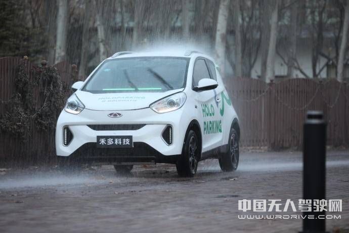 搭载了 HoloParking 的三款车同时接到泊车指令,两辆停车,一辆取车,在模拟大雨天气下(车辆行至途中,附近的水车开始浇水模拟雨天)完成了任务。