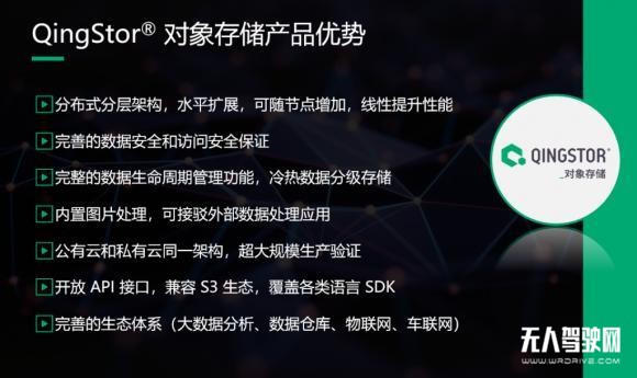 第三点,较高的性价比,目前QingStor对象存储应用较为普遍,除了今天说的用在无人驾驶领域,在大数据分析平台上也能作为大数据平台的数据存储,可以作为数据源和数据存储目标,用一套平台实现多种用途,降低整体的TCO。