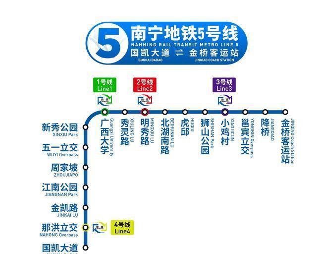 这就是南宁地铁5号线。据此,南宁地铁5号线起于国凯大道站,止于金桥客运站,全长20.2公里,沿途共设有17座车站,分别为国凯大道站、那洪立交站、金凯路站、白沙壮锦立交站、亭洪西路站、旱塘站、新阳路站、广西大学站、秀灵路站、明秀路站、北湖南路站、虎丘村站、狮山公园站、小鸡村站、邕宾立交站、药用植物园站、金桥客运站站,看看经过你家门口没?