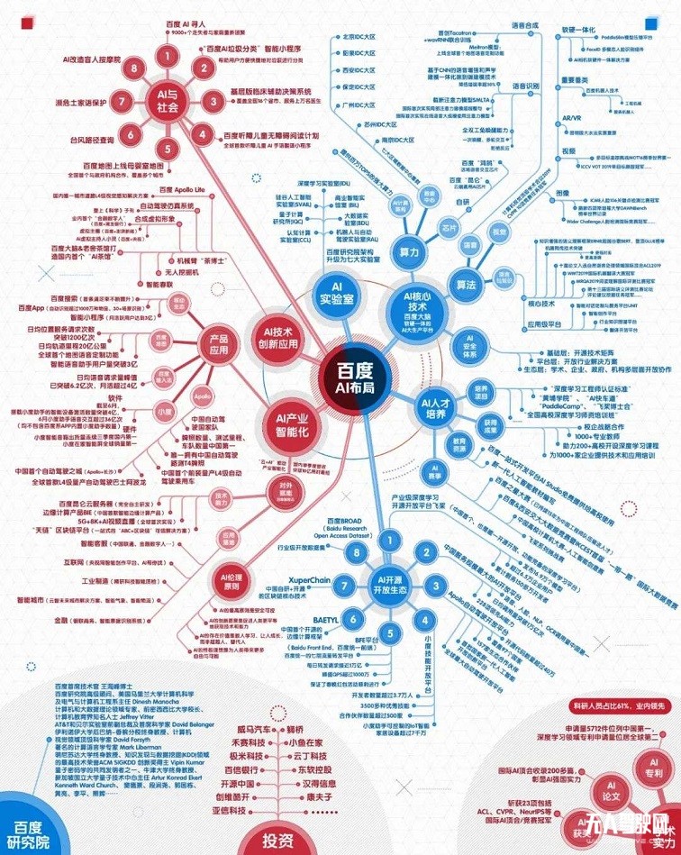 从2017年起,AI作为百度新的驱动引擎,逐渐深入其各项业务中,无论是搜索、内容分发,还是智能驾驶、医疗等,都打上了AI的烙印。基于庞大的用户数据能够让百度在AI算法上占领优势,因此百度一直在不断加码基础设施建设,不断投资人工智能基础技术。百度在中国建立了十几个云计算中心,并投资了40千兆交换机,为人工智能技术和存储提供重要支持。“百度大脑”的参数规模已经达到百亿级,创造了世界上最大的深度神经网络。