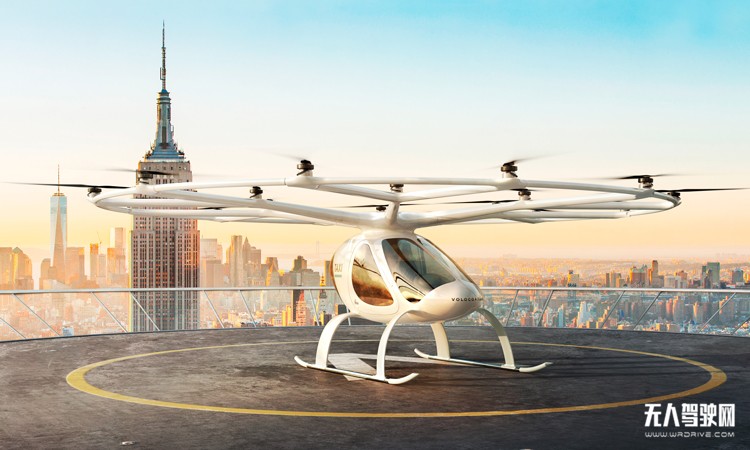 这款无人驾驶的电子飞行器名为VoloCity,由德国沃洛科普特(Volocopter)公司出产,配备18个螺旋桨和9个电池组。