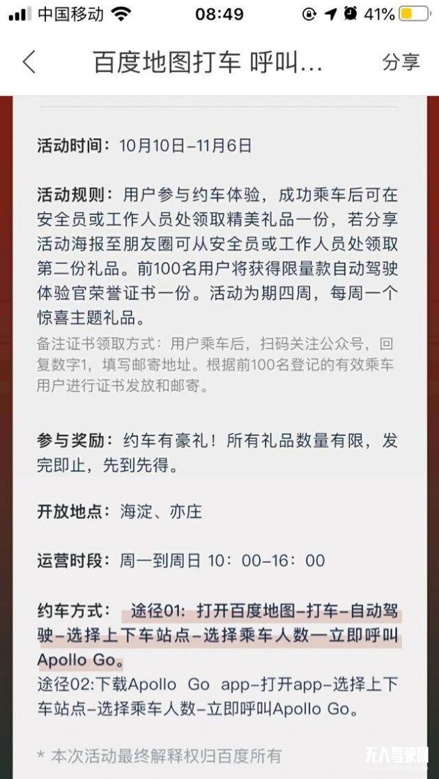 在此前,百度自动驾驶出租车服务已在长沙、沧州开放运营。此次在北京开放服务,百度Apollo Go还推出了“乘车有礼”活动,用户参与约车体验,成功乘车后还有礼品赠送,活动时间为10月10日至11月6日。