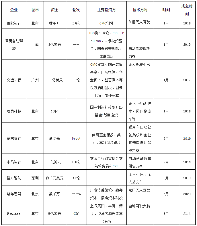 从资金投入来看,大部分企业的融资金融都超过亿元,滴滴自动驾驶、文行知远、驭势科技及Momenta则达到了十亿级以上。从投融资轮次来看,企业们处在了“两极”格局,如毫末智行、斯年智驾尚处于Pre-A轮融资阶段,而小马智行已经过渡到C+轮,当然,这与企业成立的先后关系有关。