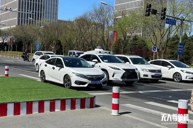 自动驾驶测试车和其他机动车辆一起等待红灯