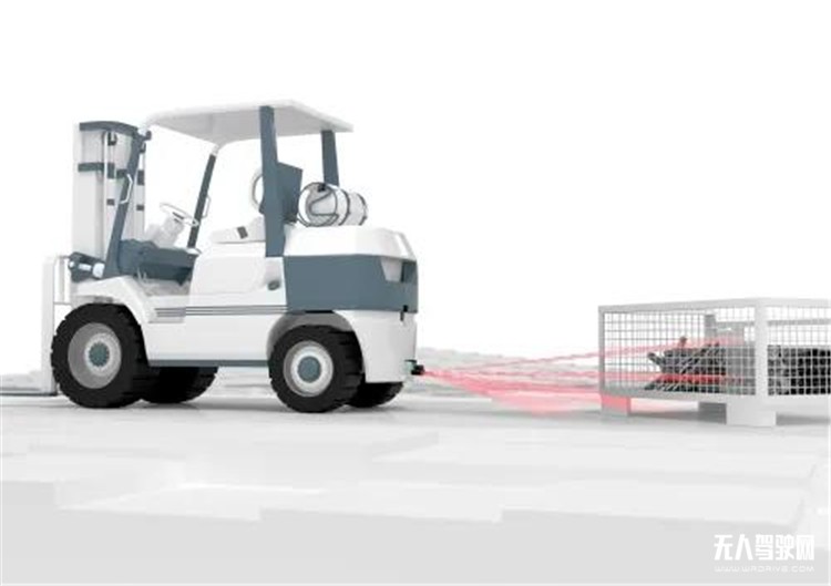 将R2300 3-D LiDAR传感器安装在叉车的后部,当叉车倒车时,光电传感器根据车辆的转向角和速度监控叉车后方的区域。R2300采用高采样频率和高测量密度,确保能够检测到各种尺寸的物体和结构。当检测到障碍物时,触发警报信号并停止车辆。