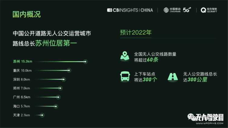 报告还预测了未来国内无人公交的发展速度,预计到 2022 年,全国无人公交线路数量将超过 60 条,上下车站点将达 300 个,无人公交路线总长达 300 公里。
