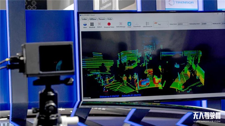 此外,雷达对低反目标的探测性能也很重要,特别是当遇到黑色的吸光物体,激光雷达的探测性能往往会大大减弱。而这方面,CH128X1似乎表现得丝毫没有忌讳。目之所及,镭神智能的展位全铺了深灰色的地毯(反射率恰好大约为10%),而CH128X1对地面的探测成像依然非常的整齐划一,包括展位里摆放的东风sharing-smart无人扫地车的黑色车体,其也是有清晰的成像可呈现出来,可见其对低反吸光的物体也依然拥有非常好的探测性能。