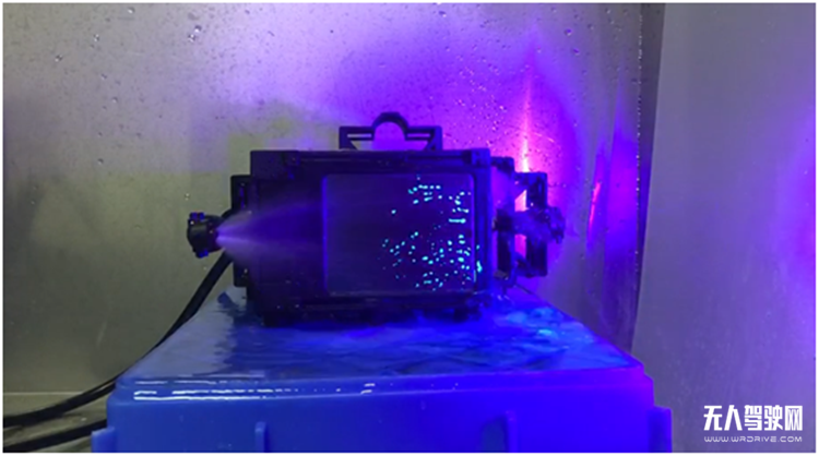 当然,把激光雷达安装在车头,最大的缺点便是容易碰到脏污问题,从而影响激光雷达的探测效果。对于此点,镭神智能也是早做了考虑,并在发布会上展示了其雷达视窗的清洁方案——可通过高压喷水清洁激光雷达视窗面的脏污,并通过风吹干镜片上的水分或通过视窗自动加热蒸发其上面的水分。