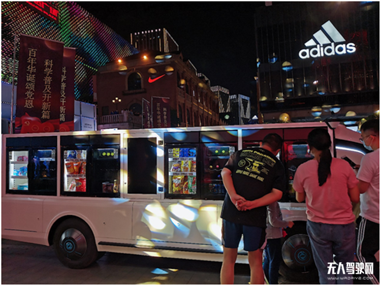 除了无人驾驶,这辆车还可以进行无人售卖。现场工作人员指着车身的橱窗介绍,该车搭载的“智能微超”可支持16人同时近车购买商品,并且车辆控制、行驶、以及车辆配置的广告屏和售卖柜电子标签都可以远程操作改写。此外车辆售卖柜摆放的产品、车身屏幕内容和语音根据活动主题可自主设计。