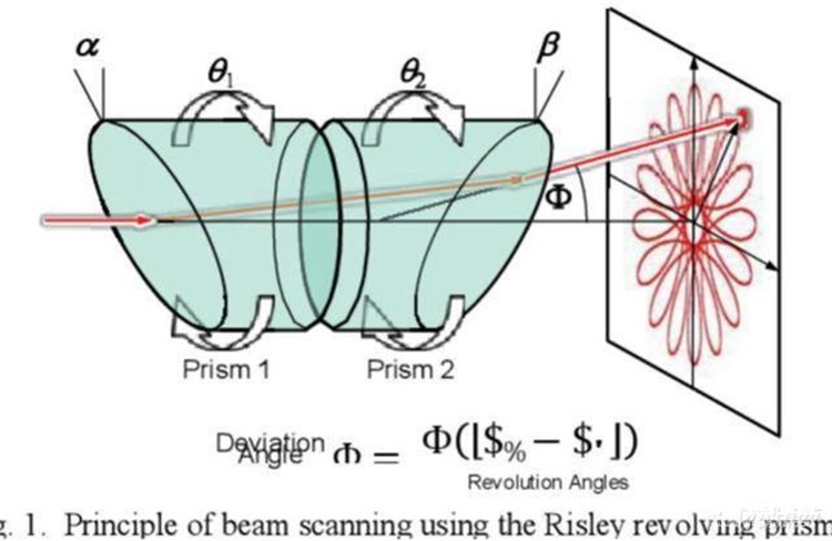 棱镜激光雷达也称为双楔形棱镜激光雷达,内部包括两个楔形棱镜,激光在通过第一个楔形棱镜后发生一次偏转,通过第二个楔形棱镜后再一次发生偏转。控制两面棱镜的相对转速便可以控制激光束的扫描形态。