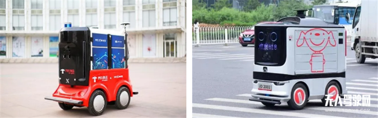 京东:2017年"6-18",京东首批试点运营的无人配送车在中国人民大学进行快递投递。2018年"6-18",在京东的北京上地配送站,20余台配送机器人整齐列阵。随着调度平台命令发出,首批载有”6-18”货物订单的配送机器人依次出发,自动驶向订单配送的目的地。