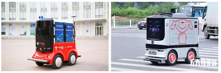 京东:2017年"6-18",京东首批试点运营的无人配送车在中国人民大学进行快递投递。2018年"6-18",在京东的北京上地配送站,20余台配送机器人整齐列阵。随着调度平台命令发出,首批载有”6-18”货物订单的配送机器人依次出发,自动驶向订单配送的目的地。