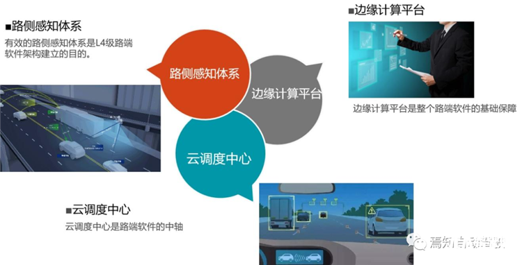 L4级自动驾驶系统的开发的软件架构中不仅包含常规的车端软件,也包含后续新一代的路端软件。路端软件实际是指包含路端感知体系、云端信息调度以及边缘计算平台三个大模块。