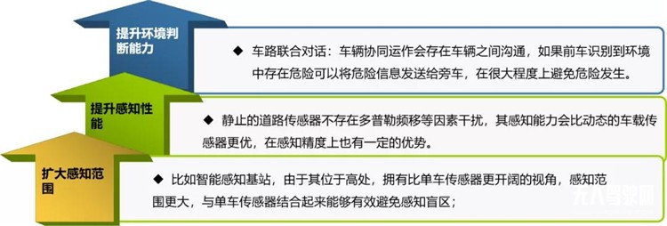 自动驾驶汽车涉及人和车、车和车、车和路之间的默契配合。考虑道路智能化,把智能设备安置在道路上,通过通信网络,感知到的数据可以共享给周边更多车辆,这样将使自动驾驶更好的运作在定义的设计环境中,减少碰撞等危险因素。