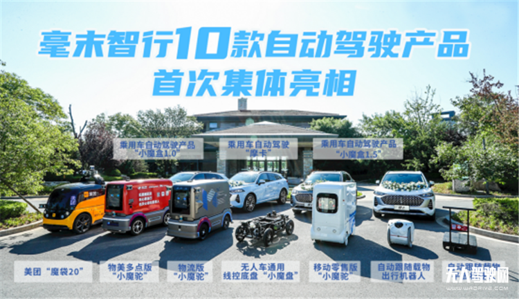在此次活动中,毫末智行主打城市通勤场景的乘用车自动驾驶产品“小魔盒1.5”、无人配送车“小魔驼”、无人车通用线控底盘“小魔盘”等10款产品首次集体公开亮相。
