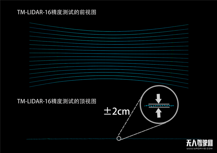 TM-LIDAR-16采用脉冲测距法,能抗强光干扰,且误差大小受量程影响较小,在150米以内,墙面精度控制在±2cm。