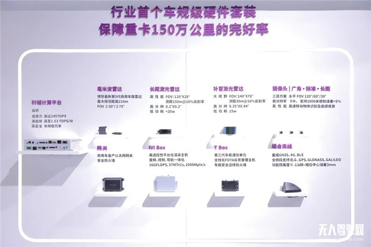 在这次大会上嬴彻也首次展示了全套车规级硬件套装,包括长距和补盲激光雷达、毫米波雷达、摄像头、GPS/IMU、计算平台、网关、T-Box、IVI-Box等,所有零部件均经过包括工程、开发、生产三阶段的严格认证,和电气、机械、环境和电磁的试验验证,满足重卡150万公里生命周期的可靠性耐久性。