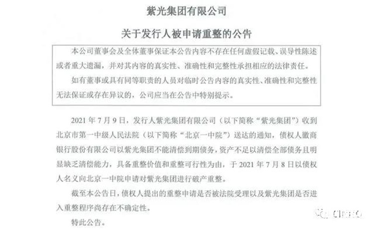7月9日,紫光集团公告,收到北京市第一中级人民法院通知,债权人徽商银行以紫光集团不能清偿到期债务、资产不足以清偿全部债务且明显缺乏清偿能力、具备重整价值和重整可行性为由,向法院申请对紫光集团进行破产重整。
