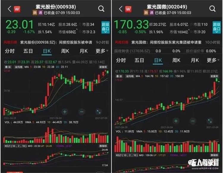 截至7月9日收盘,紫光股份报23.01元,下跌1.67%,市值为658亿元;紫光国微的股价在7月9日盘中创出历史新高的175.57元,收盘报170.33元,下跌0.50%,市值为1034亿元。二季度以来,紫光股份上涨17%,紫光国微上涨57%。