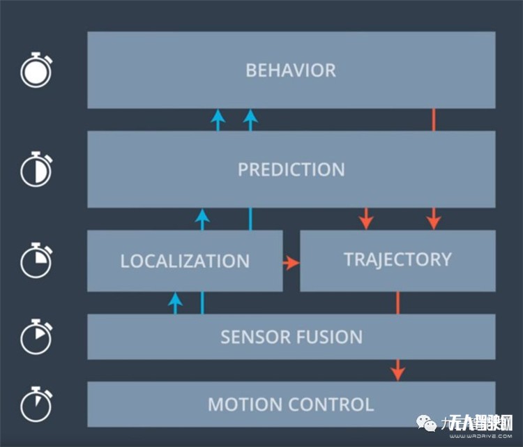 路径规划需要自动驾驶汽车不同功能层之间的合作、协调。上图给出了一个自动驾驶系统的功能层的配置形式: