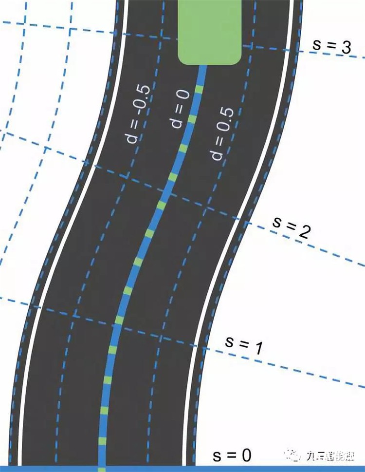 在Frenet坐标系中,可以平面上的点的位置可以由纵轴和横轴定位,分别记为S和D 。其背后的数学原理非常复杂,在此我们不进行累述。你可以认为穿过道路中心的曲线决定了S轴,并指出了车辆在路上走了多远;D轴则映射为车辆的侧向位移。下图显示了弯曲道路在Frenet坐标系上的样子: