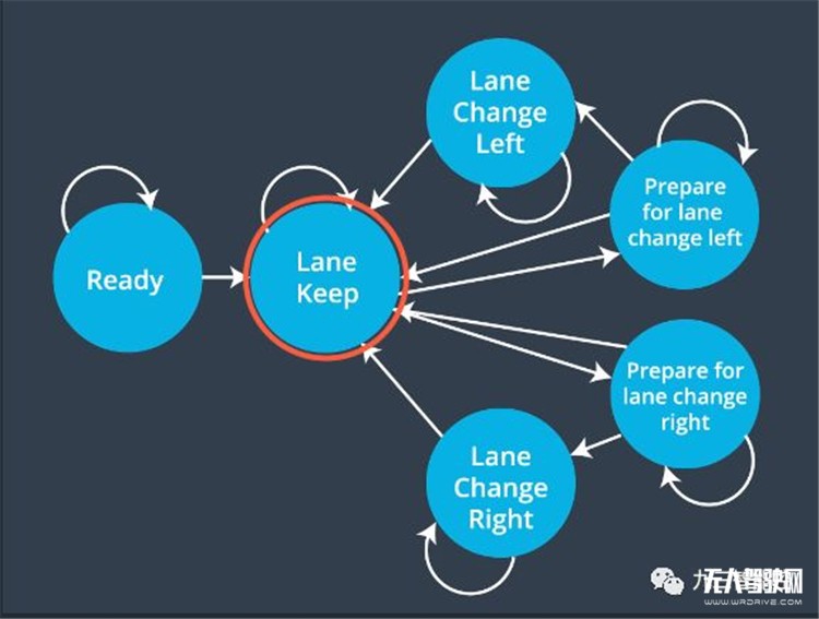 最常见的状态是保持车道,但每当我们想要改变车道,汽车将首先过渡到准备换车道的左/右状态,并在确保转换车道是安全的。在换车道前进入的中间状态,类似于车辆在换车道前打开左/右信号。