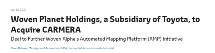 7月15日消息,据国外媒体报道,丰田汽车旗下自动驾驶子公司Woven Planet 表示,已收购美国无人驾驶汽车地图和数据提供商Carmera。
