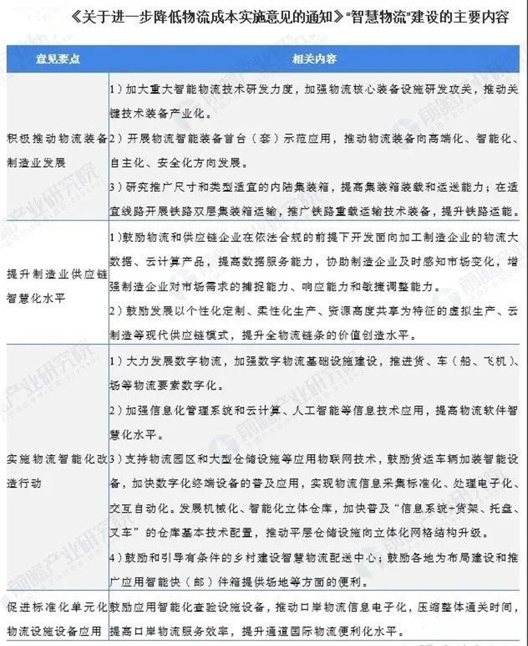 2020年全国社会物流总额300.1万亿元,同比增长3.5%。为巩固物流降本增效成果,增强物流企业活力,提升行业效率效益水平,国家发改委等多部门印发了《关于推动物流高质量发展促进形成强大国内市场的意见》,其中有关促进“智慧物流”发展的相关内容如下: