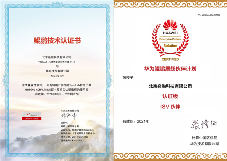 近日,经过多维度的严格验证,北京焱融科技YRCloudFile 高性能分布式文件存储产品与华为Kunpeng920 完成兼容性测试,正式获得华为鲲鹏计算领域OpenLab特予的KUNPENG COMPATIBLE证书。