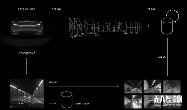 再利用车辆影子模式,但凡遇到实际驾驶情况和自动驾驶AI决策不一致的情况,这部分行车数据会自动上传至特斯拉后台数据引擎中,在被自动标注后,重新纳入已有的数据训练集中,继续训练原本的神经网络,直到新的数据被掌握。
