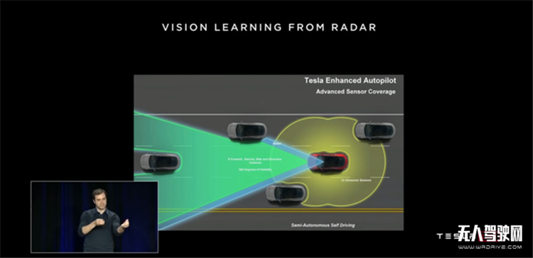 值得一提的是,在他讲解时的背景幻灯片右下角上,清晰地注明了带有毫米波雷达的自动驾驶算法是“Semi-Automonous Self Driving”,翻译过来是,半自动驾驶,明显彼时的特斯拉Autopilot只是个半成品。