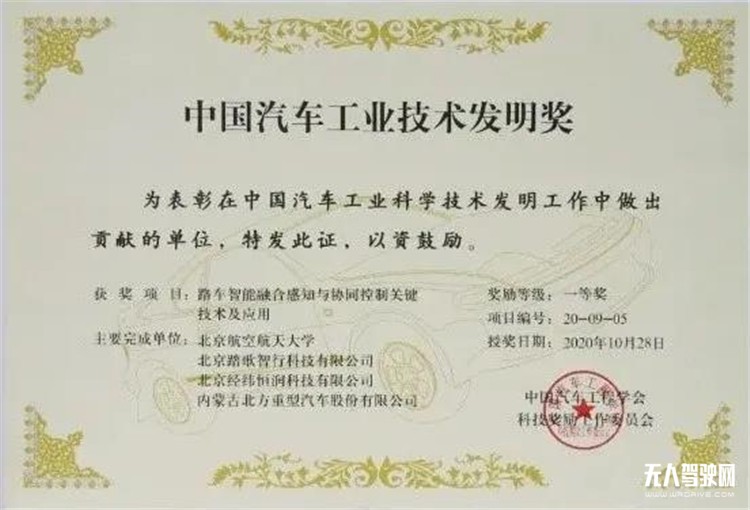 2020年10月,踏歌智行荣获中国汽车工程学会颁发的中国汽车工业科学技术发明一等奖。