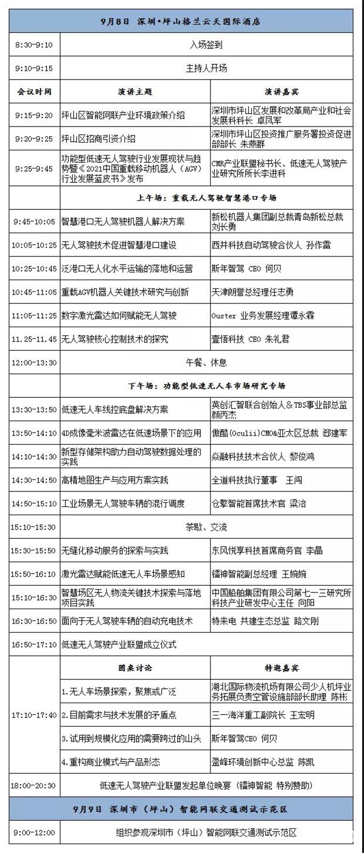 “2021功能型低速无人车产业技术发展峰会”将于9月8日在深圳•坪山格兰云天国际酒店举行,届时500+行业精英齐聚一堂,共同见证低速无人驾驶产业联盟正式成立,享受相关学术机构、投资领域专家和学者分析低速无人驾驶产业发展趋势的饕餮盛宴。