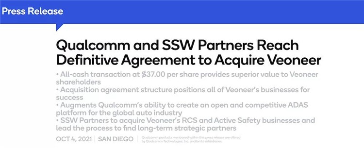 10月5日,高通宣布与自动驾驶公司维宁尔达成了最终收购协议,高通将与合作伙伴以45亿美元的价格共同收购维宁尔。高通的投资合作伙伴为SSW Partners,是一家位于纽约的投资机构。