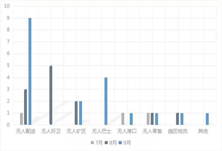 从落地产品来看,无人配送车保持上半年市场领先地位,稳当低速场景快速落地的“大赢家”。据统计的第三季度项目落地情况计算,无人配送车占比38%,其中仅9月就占了整个季度的26%。无人环卫车次之,占比15%,无人矿区、无人巴士持平均占12%。