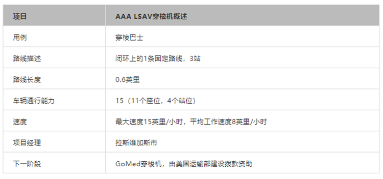 美国目前已完成或正在进行的LSAV项目有70余项,服务场所包括园区、厂区、景区、退休社区、车站、校园、医疗中心、商业中心等。以下列举了其中三个应用案例。