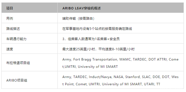 ARIBO是美国第一个提供运输服务自动化车辆的重要实施者,布拉格堡项目是ARIBO第一个全面实施的项目。该实施场地面积约为1平方英里。在该项目中,“受伤的战士”被运送到沃马克陆军医疗中心(WAMC)接受治疗,在营房和医疗中心之间频繁、短距离的门到门旅行。